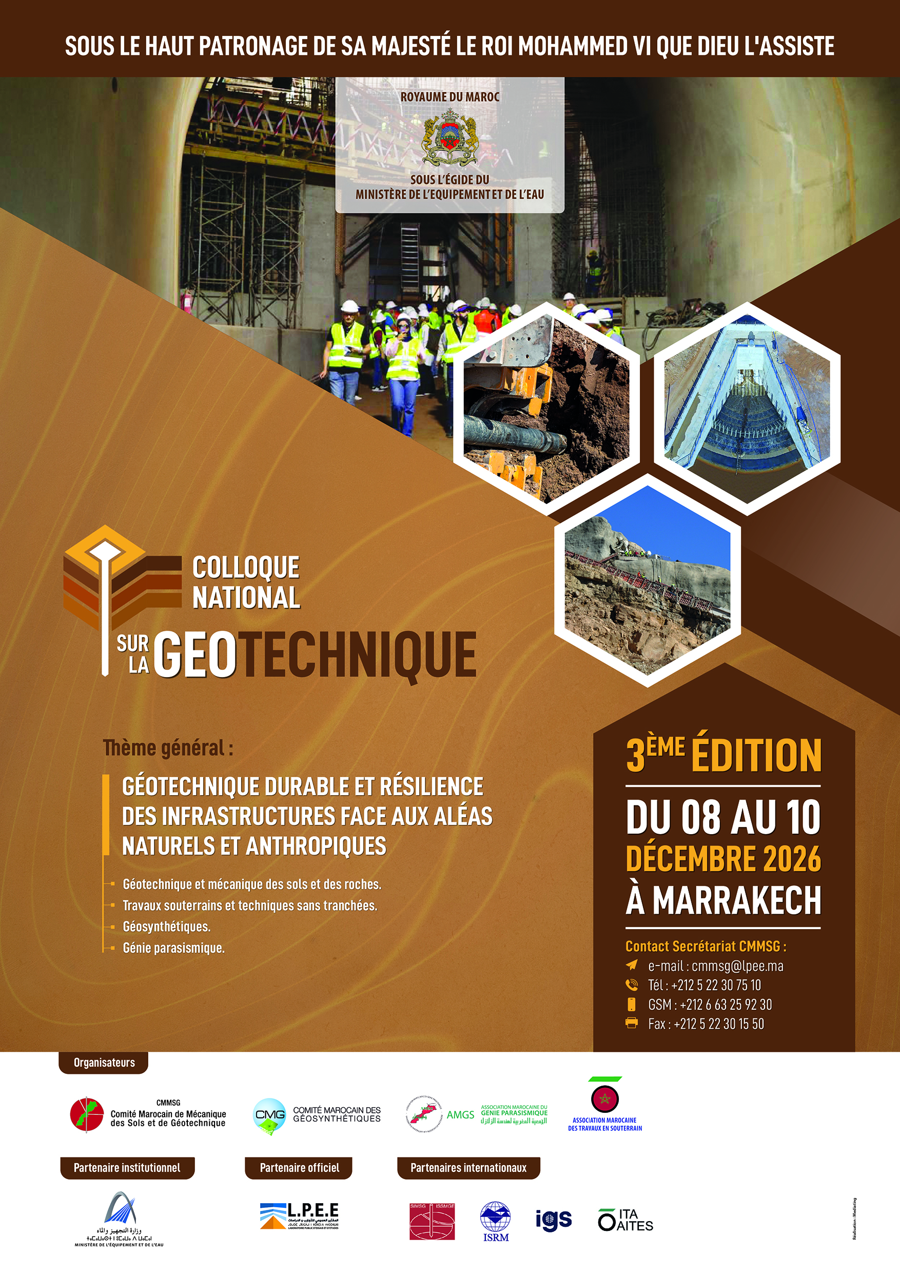 Le Maroc poursuit une dynamique remarquable de développement de ses infrastructures, sous la Vision éclairée de Sa Majesté le Roi Mohammed VI, que Dieu L’assiste. Au cours des deux dernières décennies, le Royaume a réalisé de nombreux projets structurants – autoroutes, ports, lignes ferroviaires, barrages, zones industrielles et ouvrages urbains -souvent implantés dans des contextes géologiques complexes et exposés à des aléas naturels et anthropiques croissants (séismes, instabilités de versants, inondations, agressivité environnementale, pressions urbaines…).